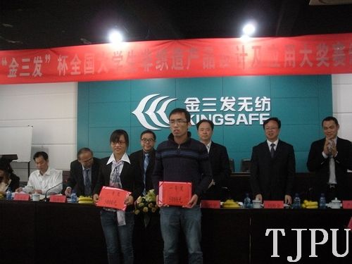 20131025,由我校发起、教育部高等学校纺织服装教学指导委员会和中国纺织服装教育学会主办,我校与浙江金三发集团有限公司共同承办的首届“金三发”杯全国大学生非织造产品设计及应用大赛颁奖典礼在浙江长兴金三发集团有限公司举行。中国纺织服装教育学会会长、教育部高等学校纺织服装教学指导委员会副主任倪阳生先生,中共长兴县委常委、常务副县长高胜华先生、浙江长兴金三发集团有限公司董事长严华荣先生以及来自长兴县政府和获奖学校的师生代表出席了颁奖典礼。颁奖典礼由我校纺织学院副院长、教育部非织造材料与工程专业分教指委主任钱晓明教授主持。