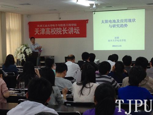 5月15日下午,由我校电子与信息工程学院主办的“天津高校院长讲坛”第一讲在学院报告厅举行。此次讲座邀请到的是南开大学电子信息与光电工程院长赵颖教授,赵院长作了题为《太阳电池及应用现状与研究趋势》的讲座,学院150余名师生聆听了讲座。讲座由电子与信息学院副院长肖志涛主持。
