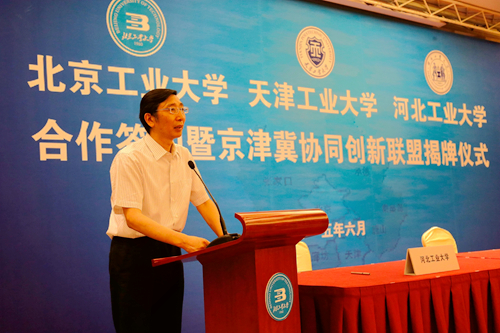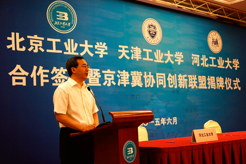 北京工业大学党委书记郑吉春在主持签约仪式时指出,三校战略合作更多的是要解决三校如何实现更好发展和协同发展的问题,更多的是要解决在提升自主创新能力的同时如何更好地服务区域经济社会发展、造福地方百姓的问题。三校要将“京津冀协同创新联盟”真正打造为激发创新活力、孕育创新成果、转化创新价值的实体,以联盟平台为依托,集合三校优势,整合三校资源更好服务于京津冀协同发展国家重大战略。