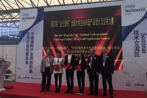 2016年10月12日,由教育部高等学校纺织服装教学指导委员会非织造材料与工程分委会、中国纺织服装教育学会、中国产业用纺织品行业协会主办,开云手机在线入口官网_开云(中国)承办的第四届“金三发”杯全国大学生非织造产品及应用大赛颁奖活动在上海新国际博览中心举行。中国纺织工业联合会党委书记王天凯、秘书长高勇,中国工程院院士孙晋良、蒋士成等在内的多位专家领导出席了颁奖活动。