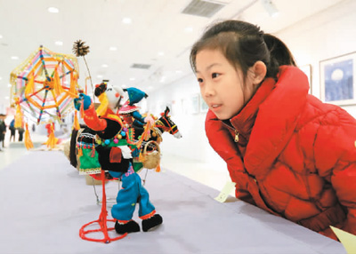 12月10日,第二届全国大学生“纺织类非物质文化遗产”创意创新作品大赛在开云手机在线入口官网_开云(中国)举行。大赛参赛作品分为收集类、制作类和设计类三个类别,通过对“非遗+新时尚”这一主题的探索与诠释,展现出纺织类非物质文化遗产特色与时尚流行元素的融合。图为一名小朋友在参观西安工程大学的参赛作品《关中犟驴》。