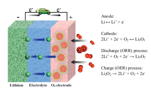 最近几年,随着电动汽车风靡全球,其核心的电池关键技术在各国受到了前所未有的关注和支持,涌现出越来越多的创新技术。锂离子电池是目前普遍应用于电动车的动力电源,经过多年努力,其能量密度已接近其理论值,但仍无法满足电动车的续航要求。近年来,对锂空气电池、锂硫电池等下一代锂电池技术的研究已进入到白热化的状态。锂空气电池拥有极高的理论比能量,是锂离子电池的3~5倍。锂空气电池负极使用金属锂,正极使用空气中的氧气,可以最大限度地提高电池的比容量,降低电池的重量和体积。其示意图如图一所示。然而锂空气电池实现商业化还需要克服一系列难题,其中碳材料氧电极的稳定性低和锂氧反应机理模糊不清一直阻碍着该类型电池的快速发展。