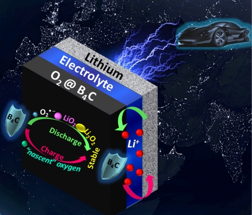 宋世栋教授与PNNL合作,首次将碳化硼(B4C)单独作为氧电极材料应用于锂空气电池中,实现了250次(1600小时)的充放电循环,是碳纳米管氧电极寿命的2倍以上,其示意图如图二所示。该成果为锂空气电池稳定材料体系的建立做出了重要贡献。该团队还通过在B4C上负载超细纳米Ir催化剂,有效地降低了电池的副反应,为锂空气电池的研究与发展提供了崭新的思路。此外,该团队配合环境分子科学实验室(EMSL)首次通过高分辨环境透射电镜在原位实时研究了锂氧反应,为反应机理的研究提供了坚实和确凿的证据。锂电池领域的著名科学家Yang-Kook Sun等人针对此工作在Nature Nanotechnology上发表了评论性文章,称赞此工作为锂空气电池的设计和优化提供了坚实的基础。(审稿:环化学院 许世超 编辑:宣传部 武冰洁)