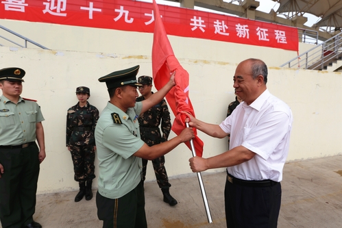 随后,刘亚男副书记为今年携笔从戎应征入伍的新兵代表佩戴绶带,杨庆新校长为2017级学生军训团授旗。武警天津市总队滨海新区支队一大队政治教导员蒋林林同志代表承训部队讲话,希望参训学员静心见学,耐心体悟,感受参加军训的意义内涵;严格要求,刻苦训练,磨练自己顽强的意志;严守纪律,争当模范,增强文明修养的自觉。