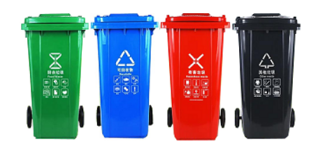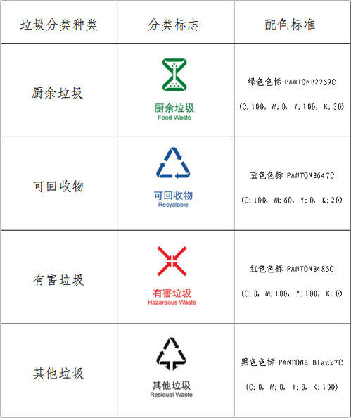 厨余垃圾投放容器一般采用绿色;可回收物投放容器一般采用蓝色;有害垃圾投放容器一般采用红色;其他垃圾投放容器一般采用黑色。生活垃圾分类投放容器的配色宜与标志配色保持一致,利于市民知晓垃圾分类,提高分类垃圾辨识度、促进分类垃圾投放准确率。