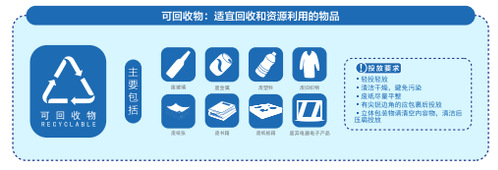 2.可回收物:可回收物是指适宜回收利用的生活垃圾,包括纸类、塑料、金属、玻璃、织物等。
