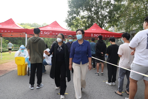 上午7时,沈江书记一行先后来到东苑学生公寓、西苑学生公寓、北苑学生公寓、教师公寓,实地查看校园疫情防控措施落实情况,详细了解了核酸检测点人员配备、现场组织等情况。她强调,要树牢底线思维、强化责任担当,严格落实各项疫情防控措施,全力保障师生生命健康安全。沈江书记叮嘱一线工作人员,要注意劳逸结合,强化自身防护,相关部门要为一线工作人员做好服务,切实解决他们的后顾之忧,让工作人员安心投入到疫情防控工作中。