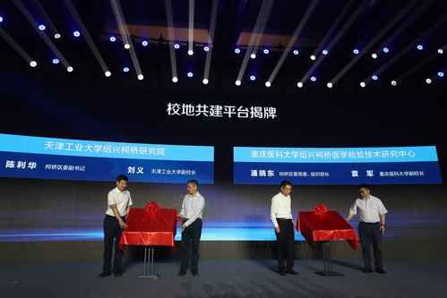 人社部留学人员和专家服务中心副主任王霄,绍兴市委常委、组织部长王琴英,绍兴市柯桥区区委书记陈豪、中国科学院院士刘云圻、中国工程院院士侯立安、我校副校长刘义、工业技术研究院常务副院长王亮出席活动。刘义副校长和柯桥区委副书记陈利华共同为研究院揭牌。