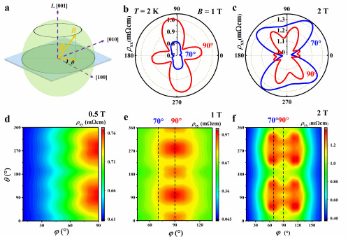 在此基础上,本工作创新性地提出通过测量稀土基half-Heusler合金单晶各向异性磁电阻(Anisotropic magnetoresistance,AMR)效应,精准表征磁场诱发能带结构和磁结构的对称性变化,最终实现磁场诱发拓扑相变的宏观输运表征。此外,本工作通过转角样品杆(见图1)和三维矢量磁场(见图2)实现了2D和3D磁场下的AMR效应表征,通过傅里叶变换完成了不同对称性的信号分离和分析,结果证实稀土基反铁磁half-Heusler量子合金中存在外磁场诱导的拓扑能带结构变化。
