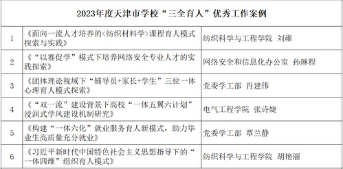 日前,市教育两委公布了2023年度天津市学校“三全育人”优秀工作案例获奖名单,我校共有6项工作案例获评优秀工作案例。
