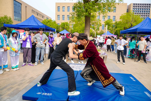 射箭、摔跤、投壶、赛陀螺、滚铁环……民族运动会赛区,来自23个学院的运动员们展示着别开生面的传统文化体验与竞技活动。弦无虚发的射箭、舞动如飞的跳竹竿、百发百中的投壶,每个项目都让参赛选手和前来体验的师生们感受到传统体育与少数民族文化的巧妙融合,充分展现了我国少数民族文化的特质与魅力。