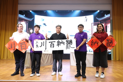 活动现场,我校艺术学院服装表演专业学生身着非遗服饰文化第五代传承人吉洳庆制作的华服优雅走秀,在第四代传承人吉洳庆嘉宾的讲述中,非遗技艺再次焕发新生。我校赵鑫教授结合学校影视传媒专业,带来“AI津心”主题分享,展现科技创新的澎湃动力。天津曲艺摇滚创始人李亮节与学校“哏儿导”团队联袂献上“爱津留津”主题说唱表演《津今有味》,用青春旋律唱响津味文化。天津市河北区非遗项目传统女子相声传承人刘春慧带来经典相声选段《智力测试》,在笑声中传递公益大爱,温暖人心。书法家孟巍带领外籍友人皮安睿、我校留学生安雅现场挥毫创作,展现天津海纳百川的开放胸怀。活动尾声,我校数学科学学院学生合唱团深情献唱《飞云之下》,将活动推向高潮。
