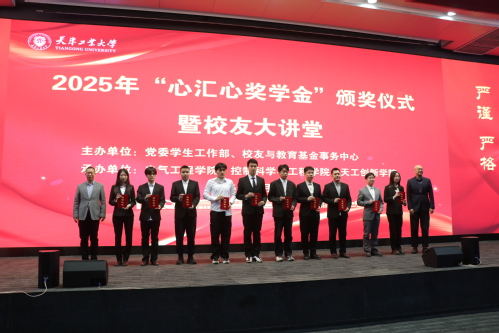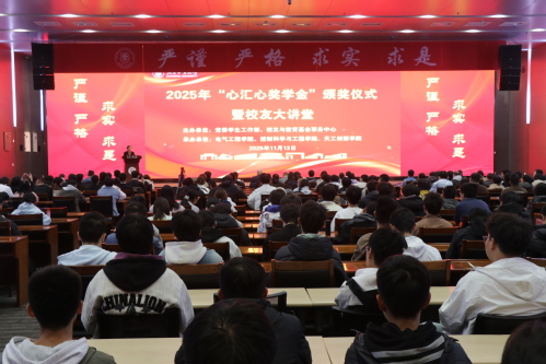 11月13日,我校2025年“心汇心奖学金”颁奖仪式暨校友大讲堂在学术中心举行。电气自动化专业90级校友、阳光心汇心基金会联合发起人、理事长、大连德迈仕董事长、我校教育发展基金会理事潘异先生,副校长沈浩鹏出席仪式。党委学生工作部、教务处、研究生院、校友与教育基金事务中心以及电气工程学院、控制科学与工程学院、天工创新学院有关负责同志及获奖学生代表200余人参会。