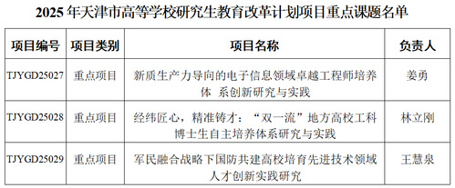 近日,天津市教委发布了《关于公布2025年天津市高等学校研究生教育改革研究计划项目立项名单的通知》,我校推荐申报的13项课题均获批立项,其中重点课题3项,一般课题10项。同时,天津市教委还发布了《关于公布2025年天津市高等学校研究生教育改革研究计划项目重大课题名单的通知》,根据天津市研究生教育发展需要,在已立项的重点课题中择优认定一批重大课题,我校姜勇教授负责的“新质生产力导向的电子信息领域卓越工程师培养体系创新研究与实践”课题成功入选。